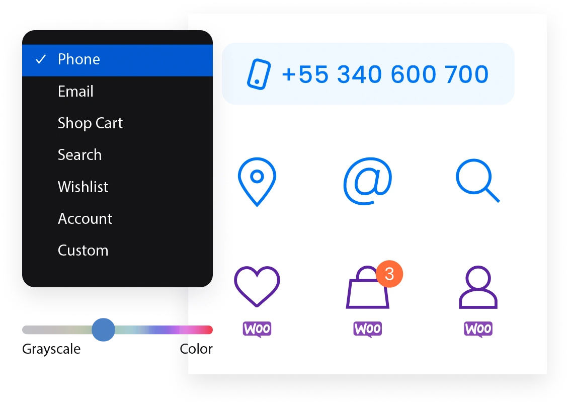 Icons that have their own predefined tasks like: call phone number, send e-mail, display shop cart, manage "My Account" details or list products from the wishlist. You can also define own, custom icons and link your own tasks to them.