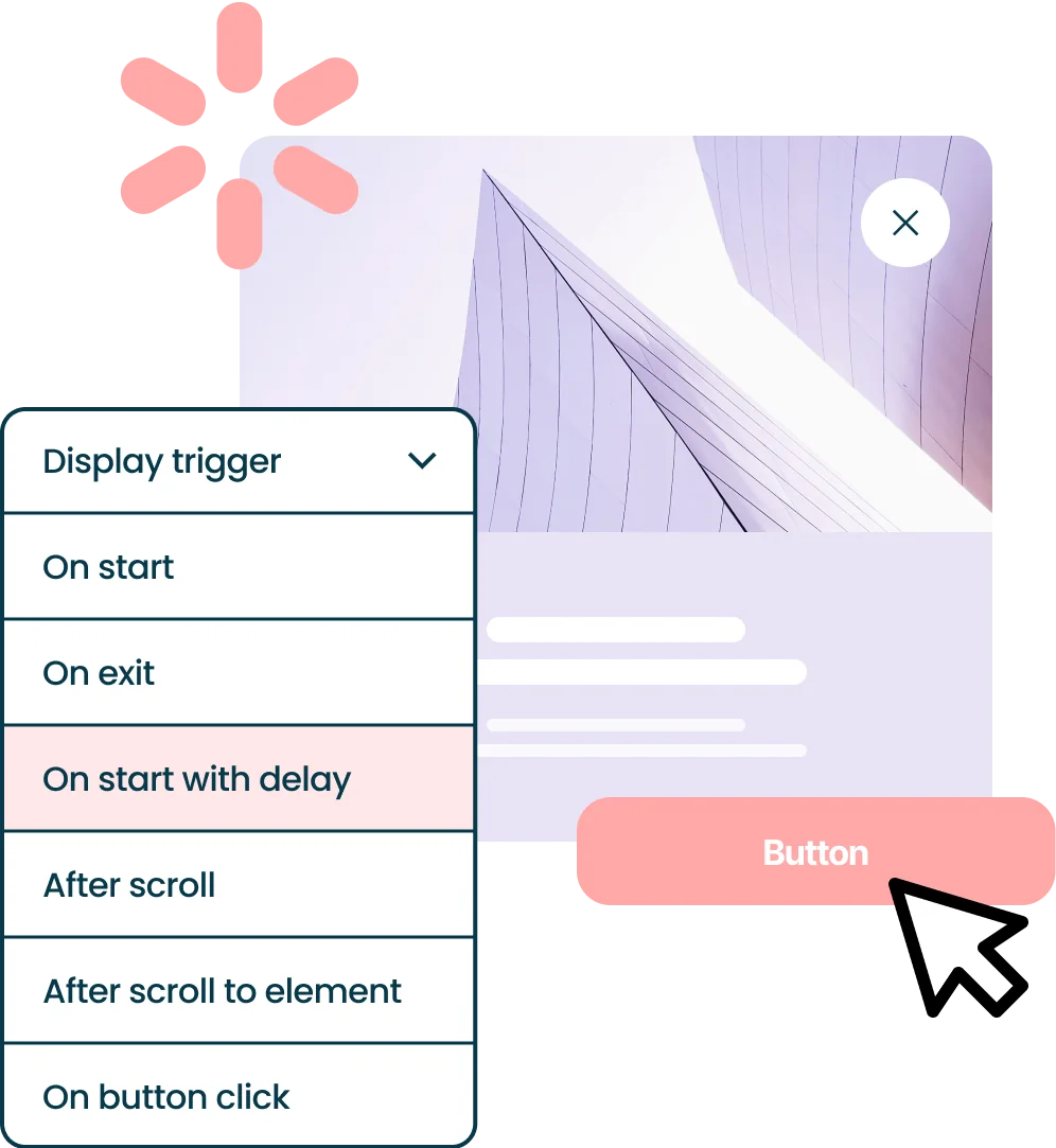 When and how you display popups is of the utmost importance. Switch between triggers like: On start, On start with delay, On exit, After scroll, After scroll to element or On button click.