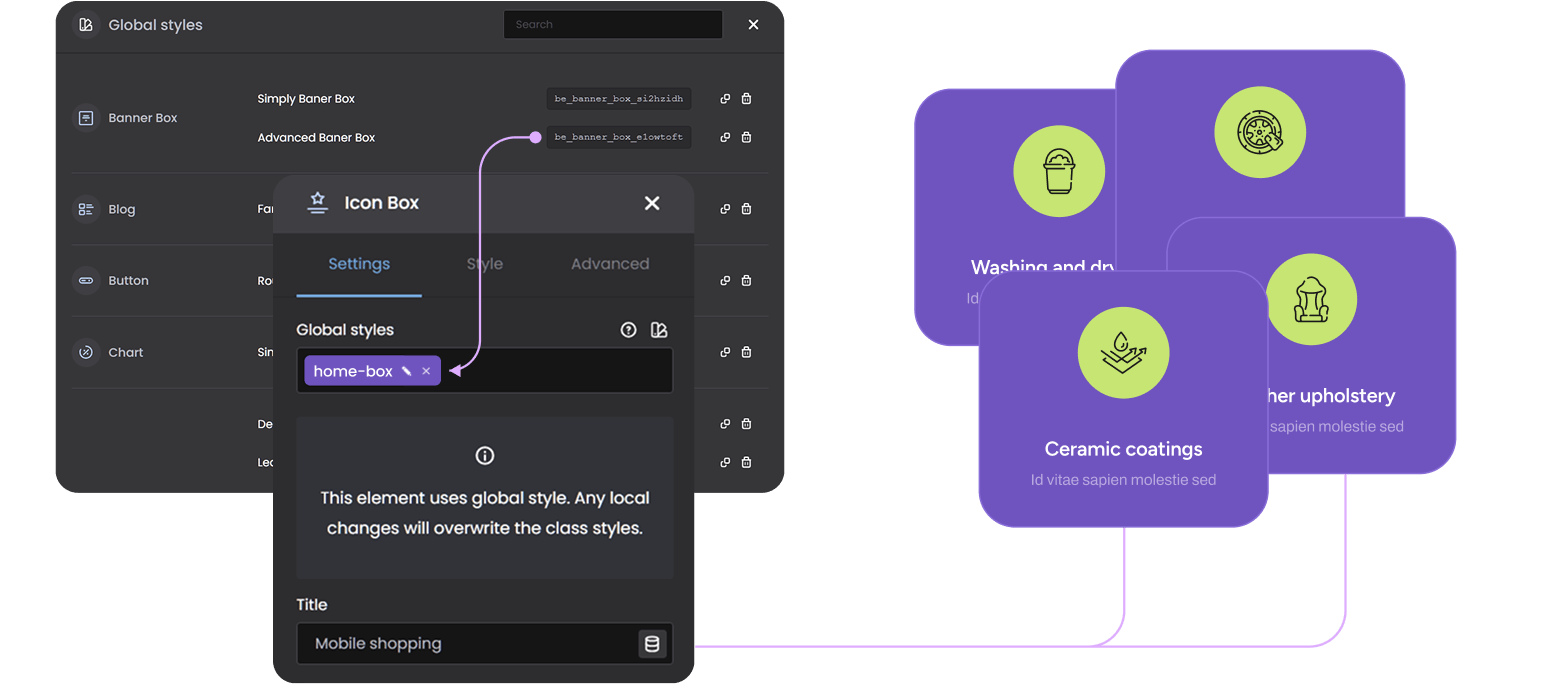 Global Styles allow you to create a unified look across your website by applying the same style to multiple elements. For example, if a particular style, such as an icon box, is frequently used, you can save it as a global style and easily apply it to other elements, ensuring consistency throughout your site.