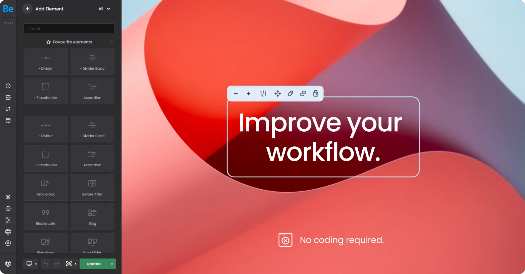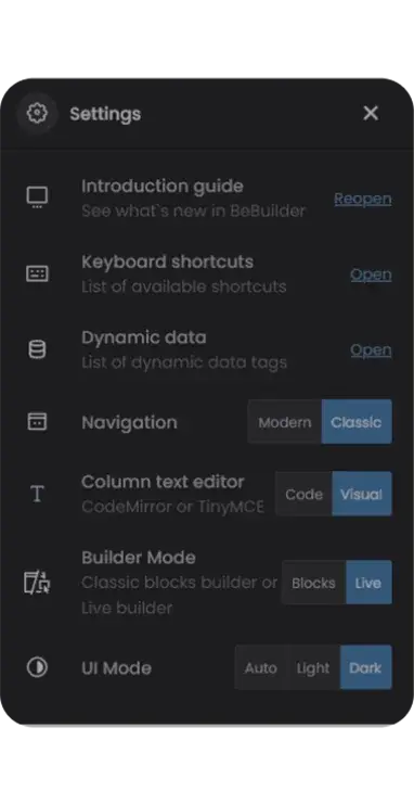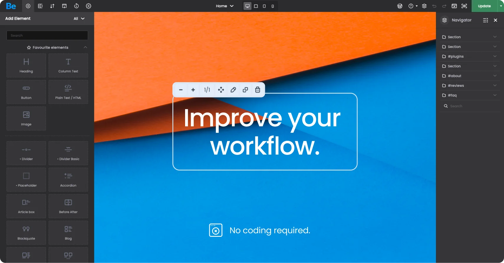 The BeBuilder has been completely rewritten with Vanilla JS. Thanks to this, the code is much lighter and the content created in it, loads in the blink of an eye. No other website builder has ever been so fast and stable.