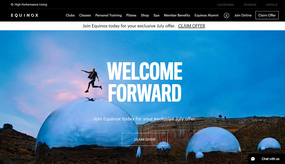 Premium fitness clubs like Equinox choose black backgrounds with minimal accents, following black website trends that signal exclusivity.