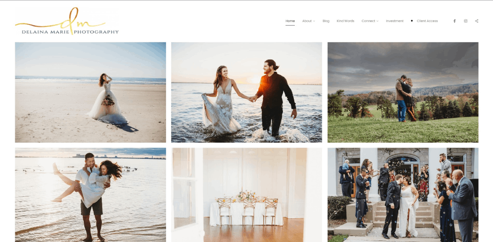 Neutral palettes (white, ivory, soft gray, black) let your photography stand out without competing colors. Luxury photographers favor muted tones like champagne or sage. Avoid bright colors that clash with diverse wedding imagery across your galleries.
