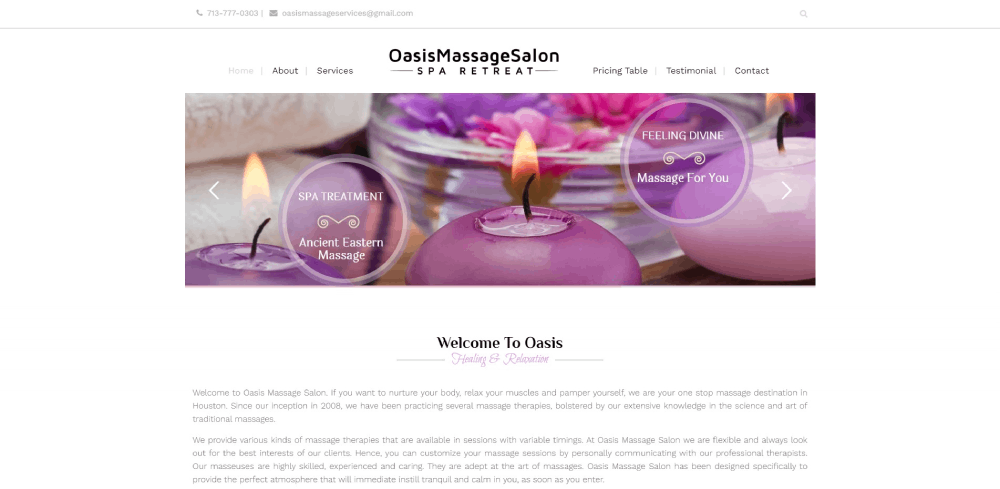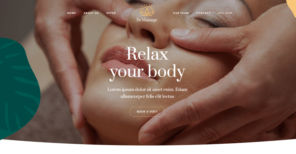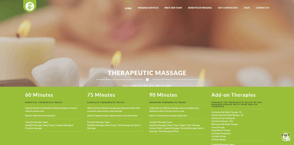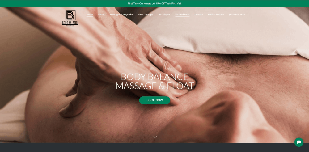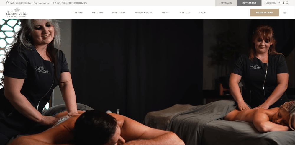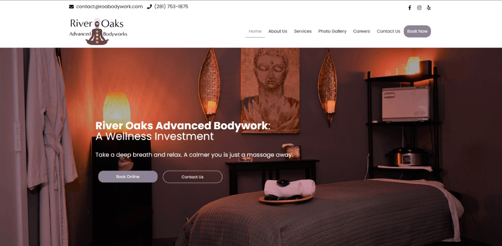 Full-width treatment room photography outperforms stock images. Websites with video background showing actual massage sessions convert 23% higher than static images.