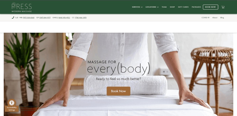 Multi-therapist studios: WordPress with MassageBook or Vagaro integration. More flexibility for staff bios, multiple service menus, location pages.