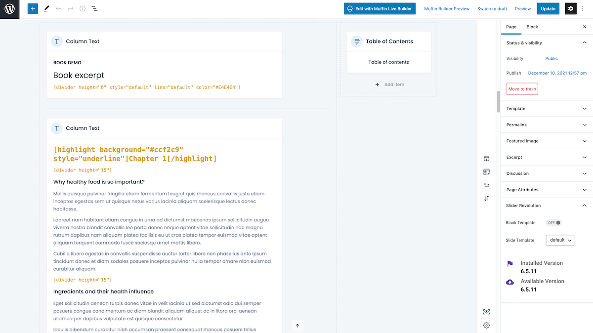Table Of Contents in the Muffin Live Builder