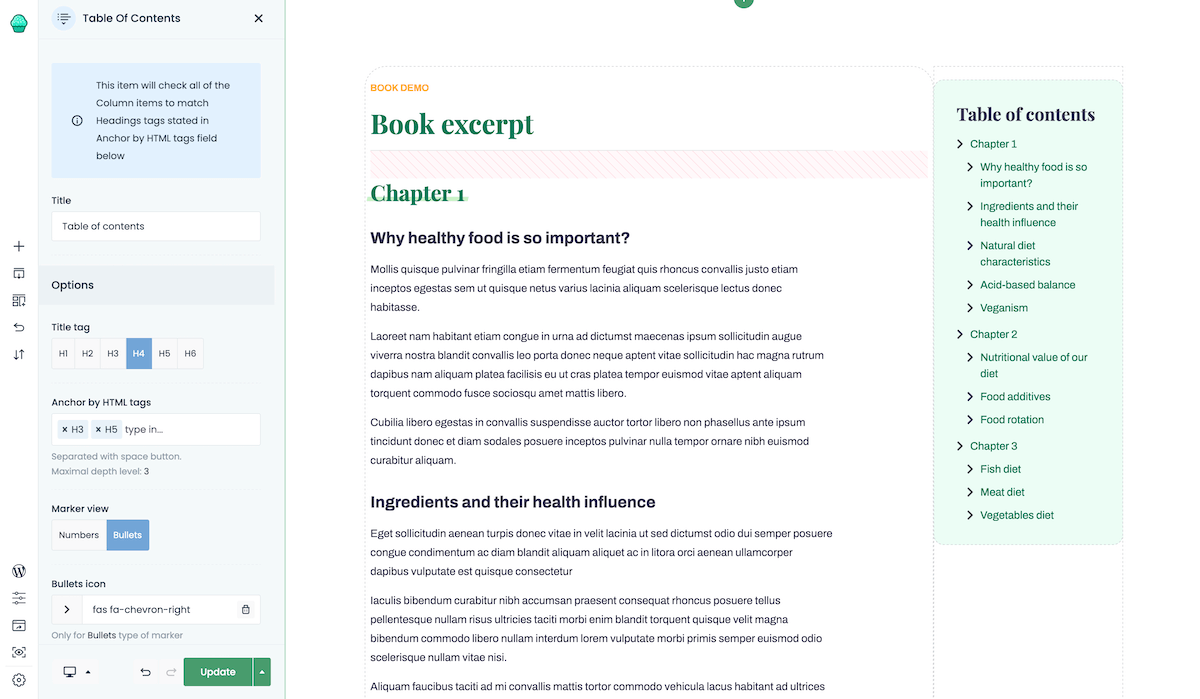 This element generate table of contents dynamically & improve articles readability and accessibility. Decide for yourself which headers from the article should be caught by the element and then display them in the correct order using numbers, bullets or custom icon.