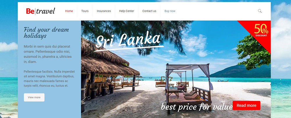 The next travel agency website template is Travelo. It has a great design and the sections integrate seamlessly into each other.