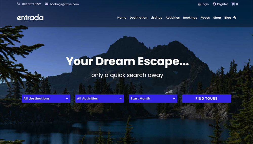 The Entrada theme is simple, elegant, and functional. Its target audience is those who offer adventure tours and other travel agencies.