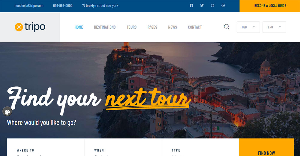 This theme includes several ready-made homepages and inner pages. There are special designs for tour lists and tour detail pages.