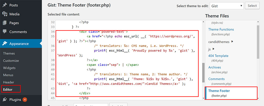 If you’ve played with WordPress before, you probably know how to edit files in the root folder. The "Proudly Powered by WordPress" message is located in the footer.php file. The code section of this file contains the exact message that pops up on your website. You can customize this file directly from WordPress’ Appearance section, using the Editor, or you can edit the file yourself and upload it back to the server. The steps below will teach you how to edit the file using the WordPress admin panel.