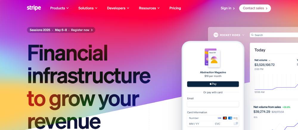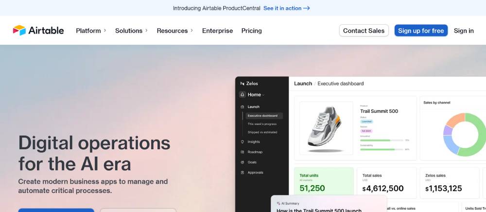Clean modular layout with strong contrast between sections. The hero section uses a split-screen approach with product visuals on the right. Bold typography hierarchy guides users through value propositions first, then features. Their color palette combines deep blues with accent colors that highlight CTAs effectively. Navigation is minimal yet comprehensive, allowing quick access to key product areas without overwhelming new visitors.