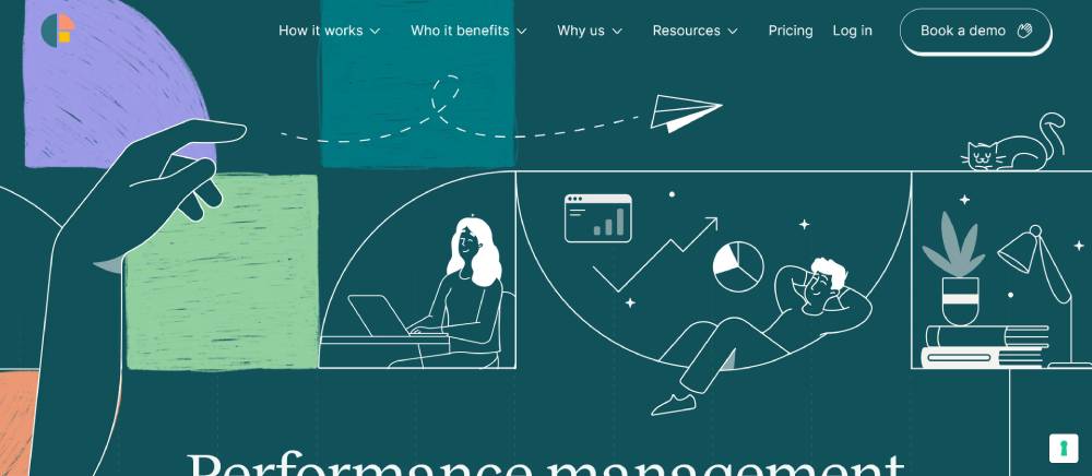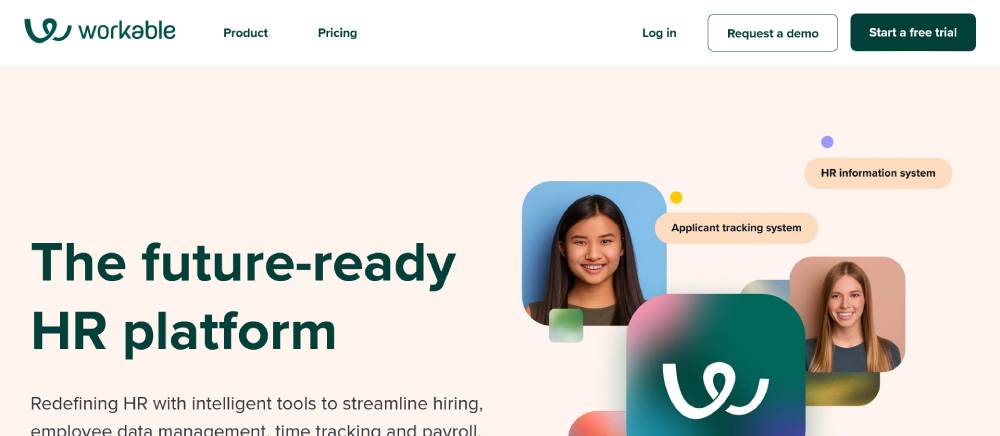 Warm color palette with soft gradients creates an approachable feel for HR software. The page uses rounded corners and subtle shadows consistently across UI elements. Content is arranged in a clear hierarchy with substantial whitespace between sections. Illustrations are simplified and stylized, matching the brand's friendly tone. The page balances text and visual elements well, preventing cognitive overload while explaining complex HR concepts.