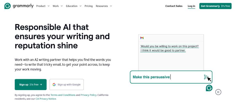 Before/after comparisons demonstrate the product's value directly. The design uses a clear visual path with directional cues guiding users through the page. Typography choices reflect the writing-focused product, with excellent attention to readability. Color usage employs a distinctive green that's become synonymous with the brand. The layout adapts intelligently across devices, prioritizing different content based on screen size.