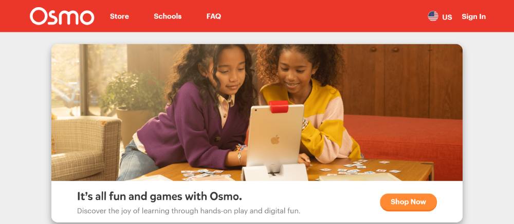 Playful design elements reflect the educational product's audience. The layout uses irregular shapes and overlapping elements to create a sense of exploration. Image selection focuses on showing the product in use by children. Typography is rounded and friendly, matching the brand's approachable positioning. Color usage is vibrant but controlled, with sections clearly delineated through background changes.