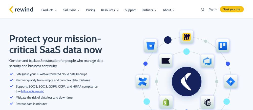 Section transitions use subtle animations that reinforce the backup and recovery concept. The layout employs clear visual hierarchy with primary and secondary content areas. Typography choices create clear distinction between product names, features, and explanatory content. Color usage combines a trusted blue base with accent colors that highlight different product offerings. Integration logos are presented cleanly, building credibility through association.