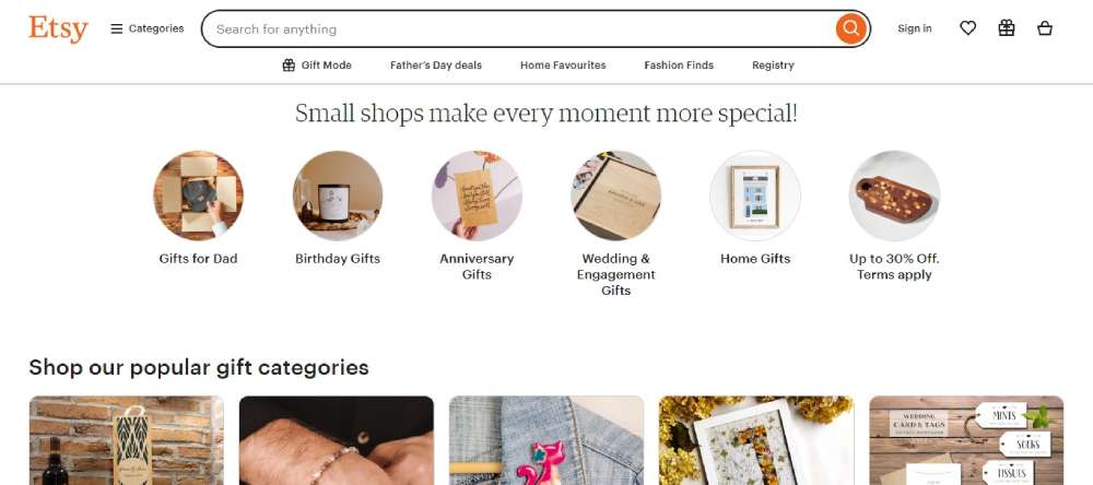 Etsy’s marketplace thrives on a responsive design that showcases their vast array of handmade and vintage items with grace. Search engine optimization (SEO) friendly content layout helps products get discovered easily while shopping, which is optimized for any device, enhancing user engagement and seller success.