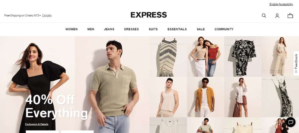Express aligns its fashion retailing with a responsive design that showcases clothing lines with stylish efficiency.
