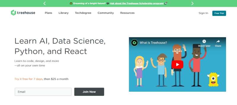 Treehouse uses a clean, accessible design that promotes its educational platform through effective use of clear font size and legibility, ensuring learners can navigate courses effortlessly.