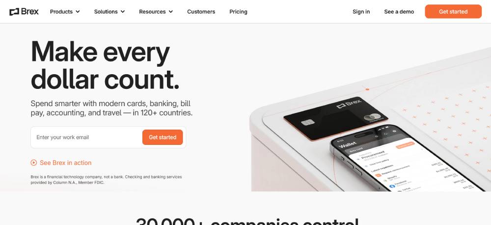 Brex’s site features high-impact call-to-action buttons that drive immediate user action. These buttons stand out with vibrant colors and clear text, promoting an easy sign-up process and seamless navigation through financial management tools.