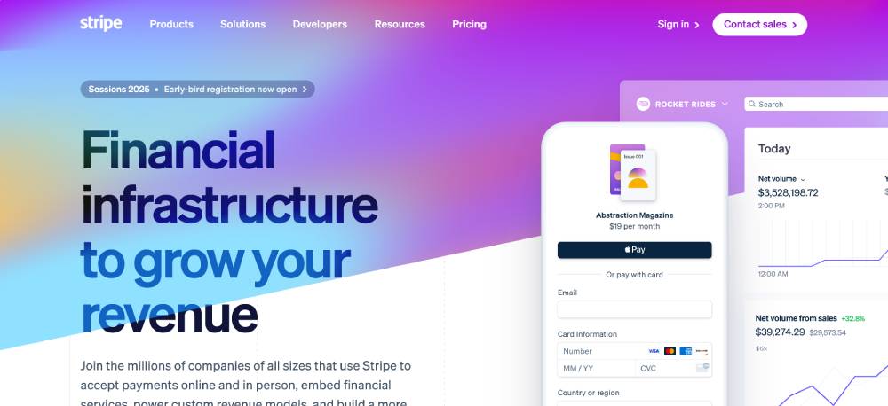 Stripe features sleek, easy-to-find call-to-action buttons that drive user conversion. The buttons stand out visually and provide clear, actionable next steps for customers. Their clean design, aligned with conversion optimization principles, makes it easy for users to sign up or learn more.